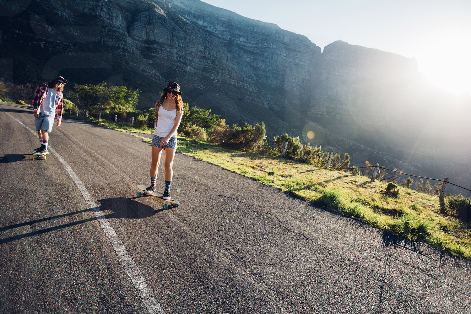 Two young people skating outdoors on rural road