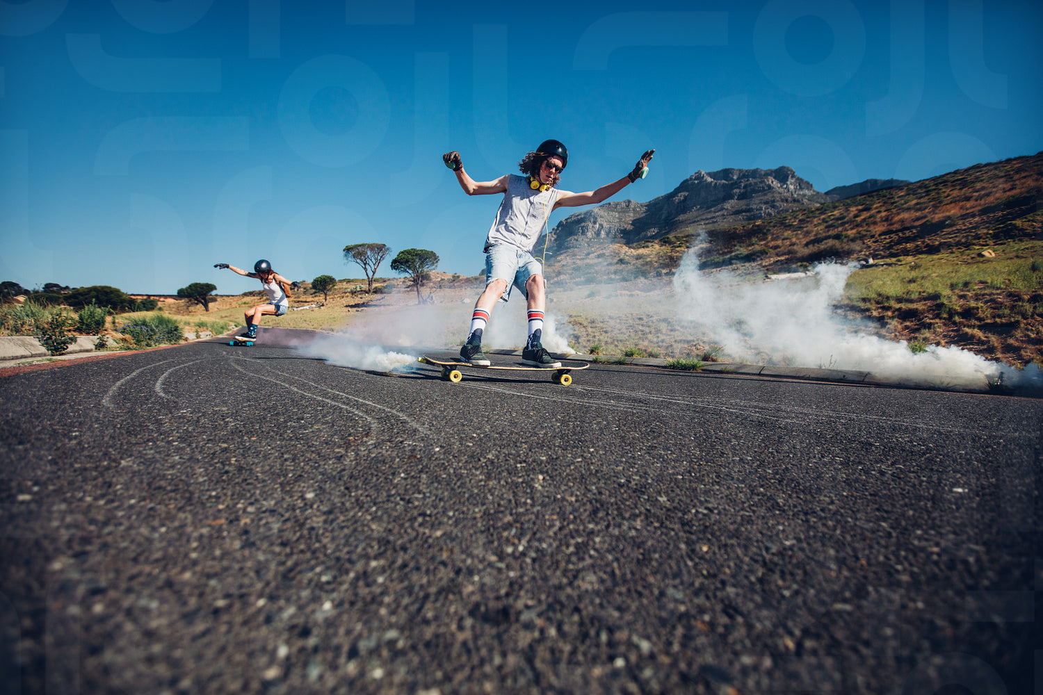 Outdoor shot of young people skating down the street. Man and woman practicing skating. Long board with smoke grenade.