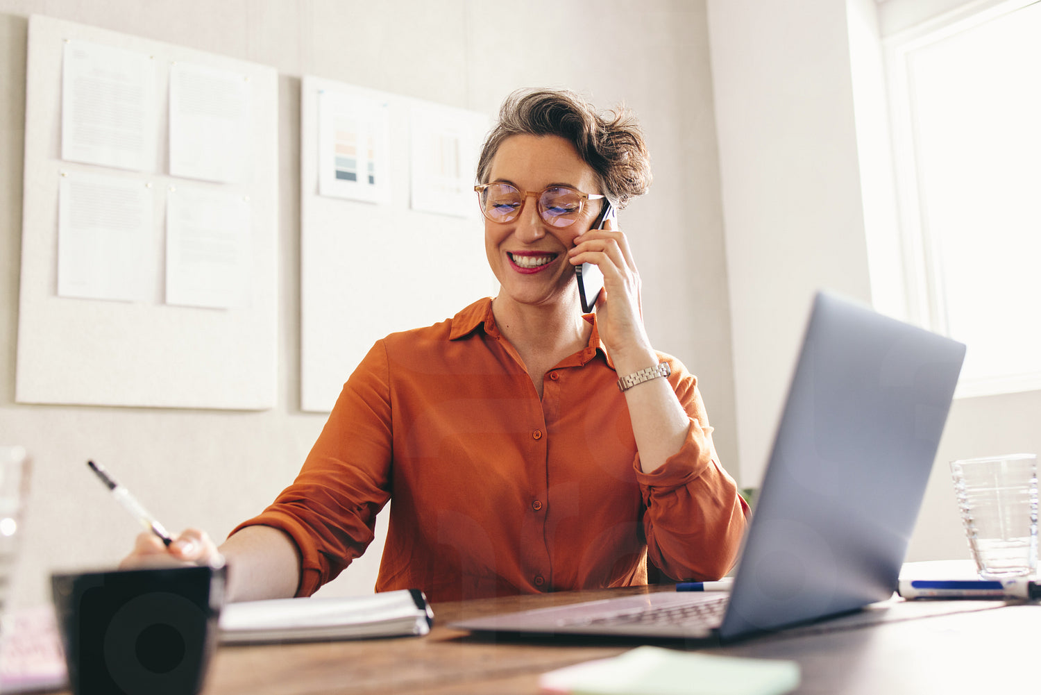 Happy businesswoman speaking on the phone while sitting at her desk with a notebook and a laptop. Smiling interior designer making plans with a client in a creative office.