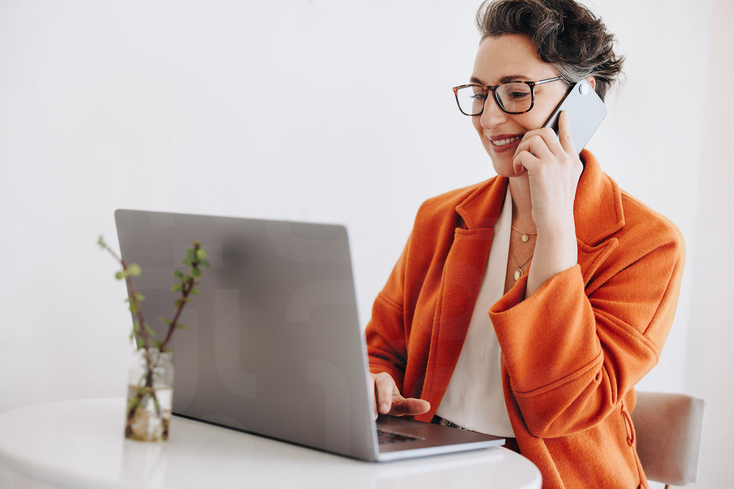 Happy mature businesswoman making a phone call and typing on a laptop while working in a cafe. Successful business woman making plans with a client over the phone.