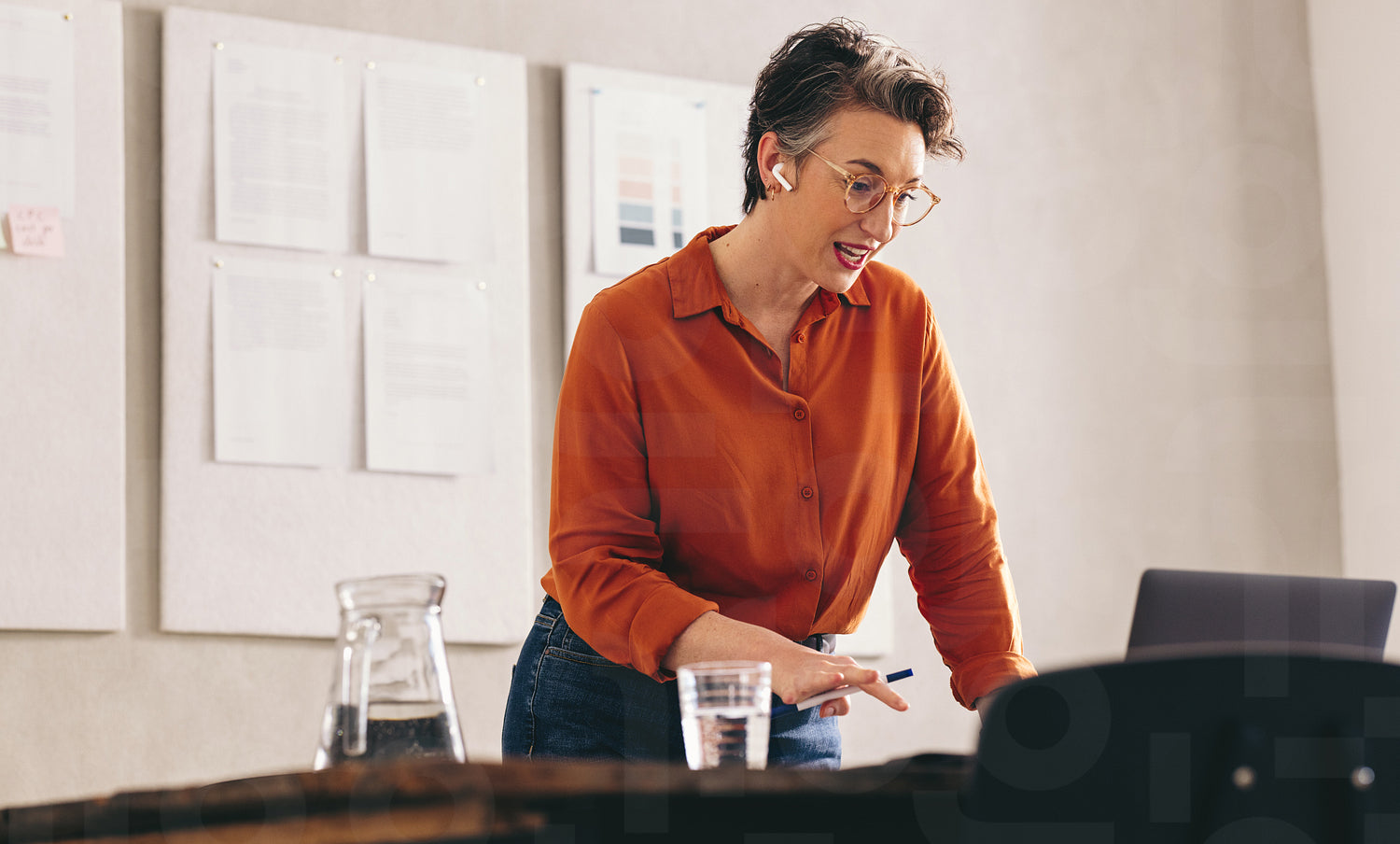 Mature businesswoman talking to her client during a video conference. Female interior designer pitching her idea in an online meeting. Mature businesswoman working remotely in a creative office.