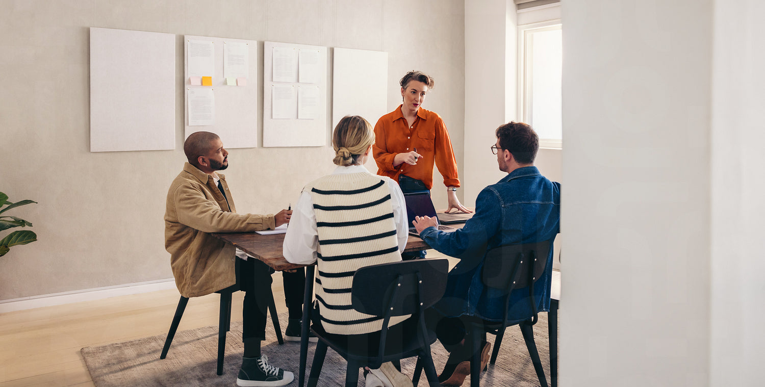Mature team leader having a discussion with her colleagues during a meeting. Mature businesswoman presenting her ideas to her team. Group of businesspeople working together in a creative office.