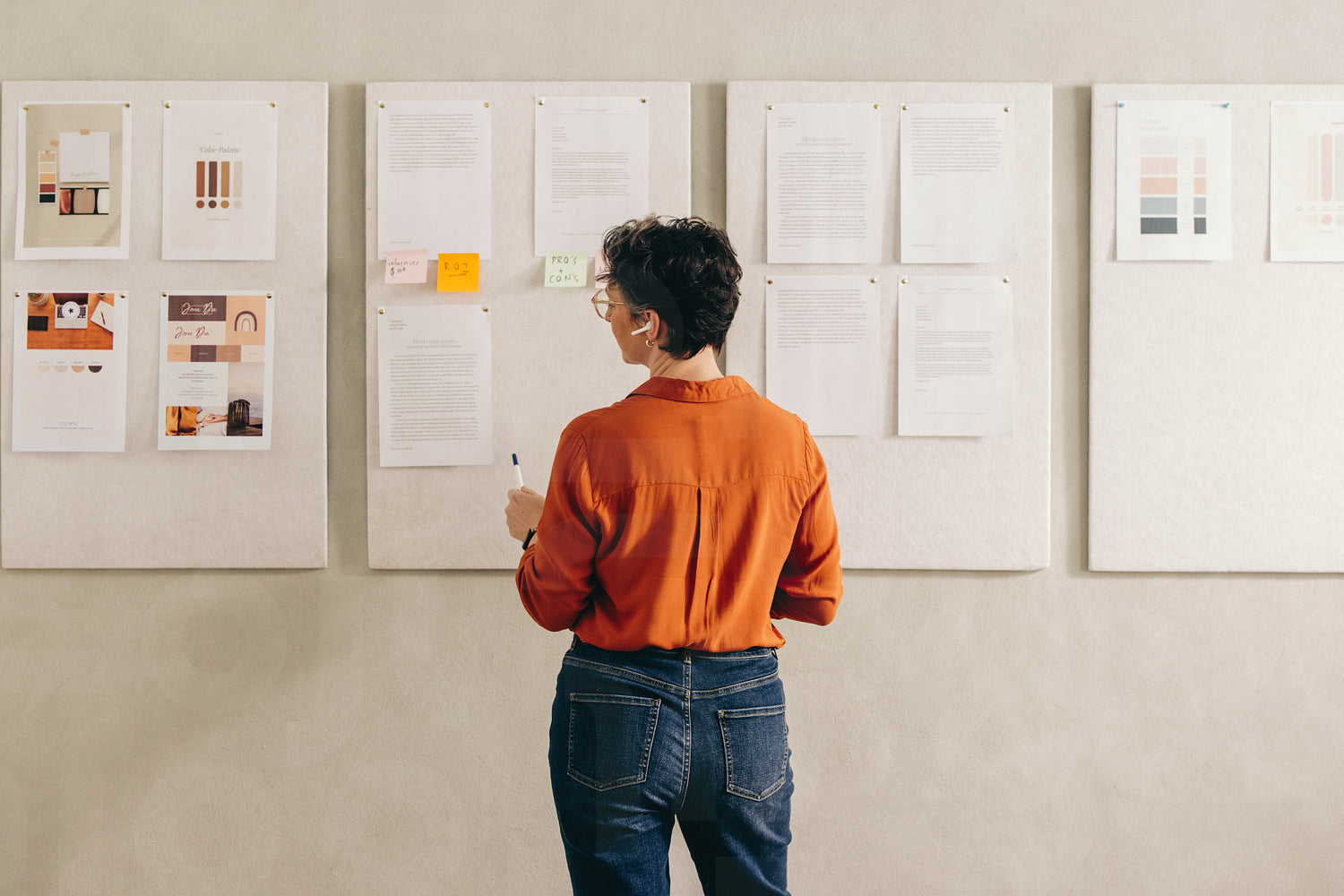 Rearview of a businesswoman giving a presentation during a conference call. Creative designer pitching her idea to her team in a virtual meeting. Mature businesswoman working remotely in an office.