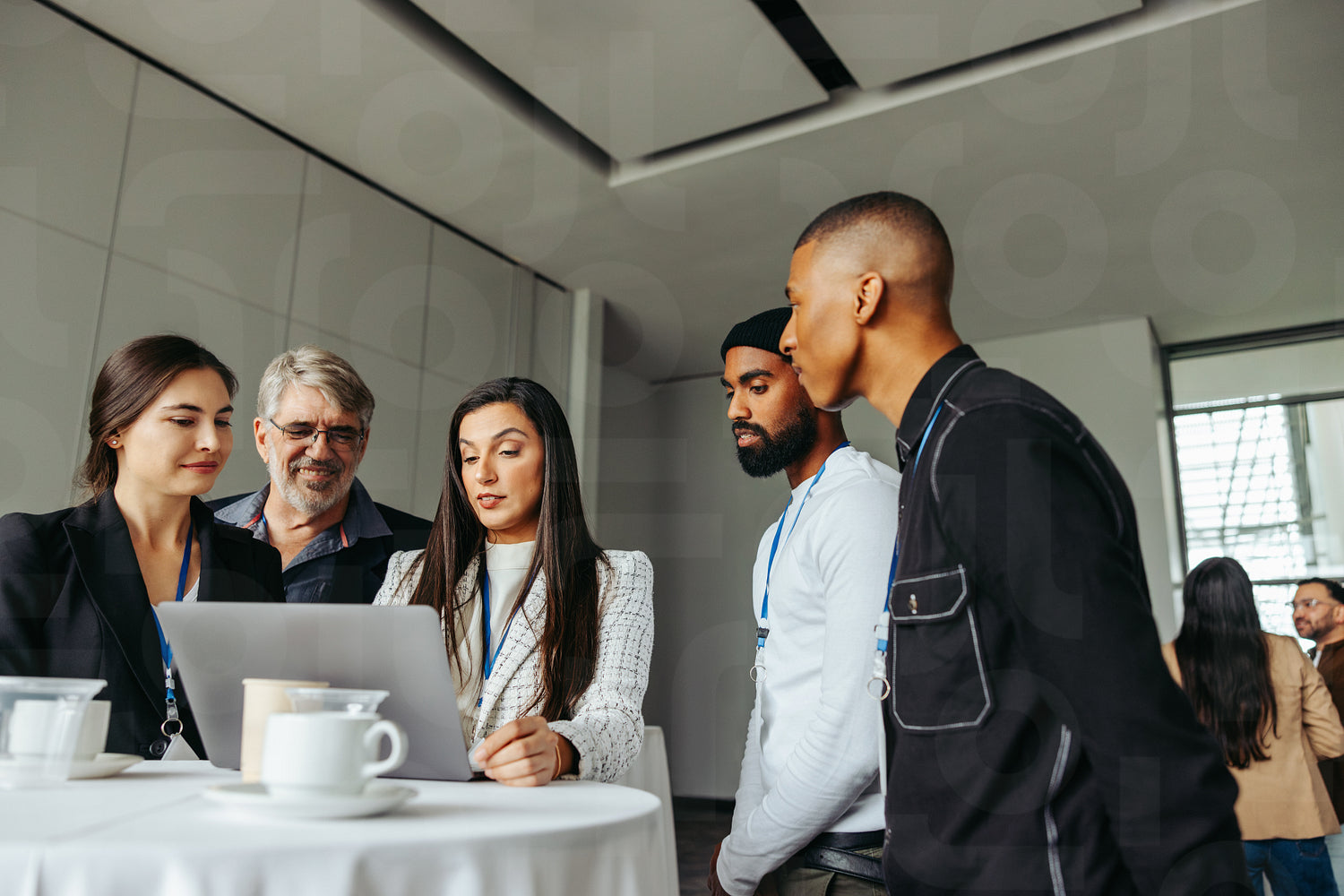 Corporate team collaborating at a business event, engaging in teamwork around a laptop