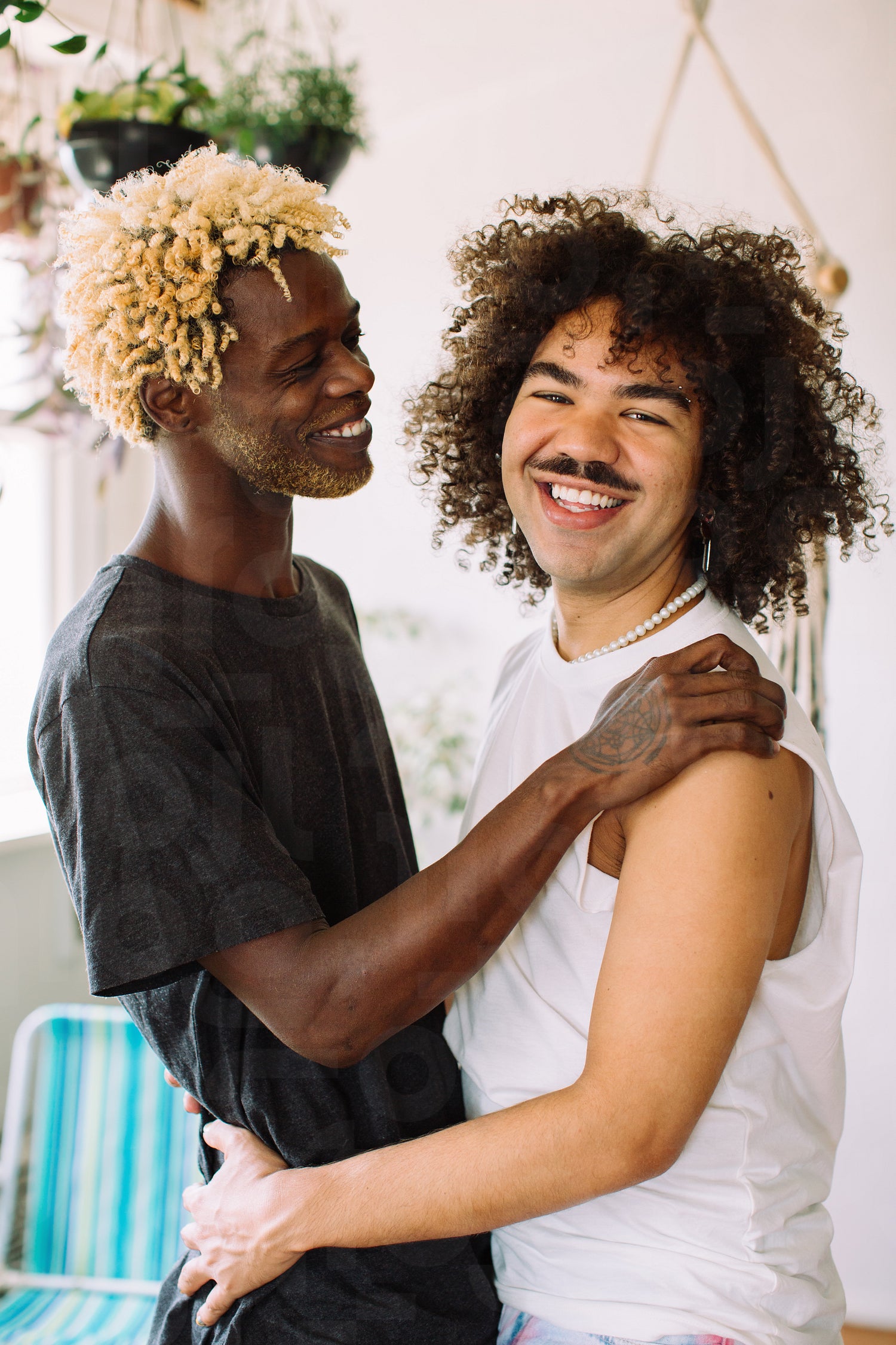 Carefree young gay couple embracing each other indoors. Two romantic young male lovers smiling cheerfully while standing together in their apartment. Happy young gay couple bonding at home.