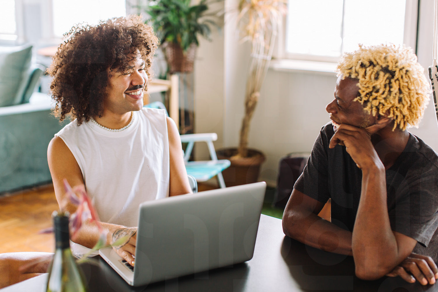 Gay couple having a cheerful chat together at home. Romantic young gay man sharing a laugh with his lover while using a laptop. Young gay couple sitting together at a table indoors.