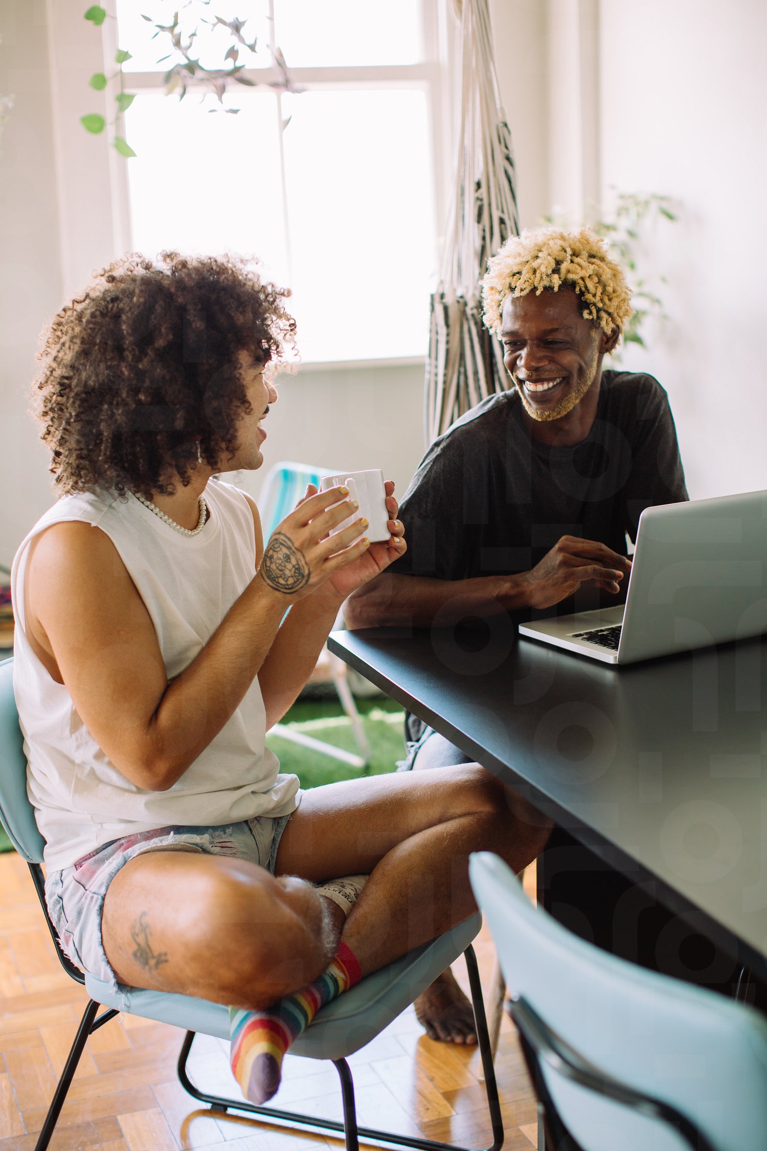 Happy young gay couple following their morning routine at home. Two young male lovers smiling cheerfully while sitting together at a table in their apartment. Young gay couple living together.