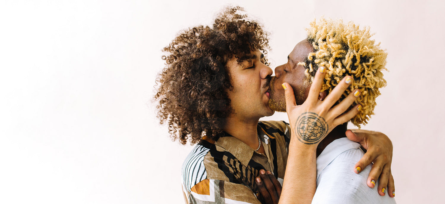 Passionate young gay couple kissing each other. Two young male lovers sharing an affectionate moment while embracing each other. Young gay couple standing together against a studio background.