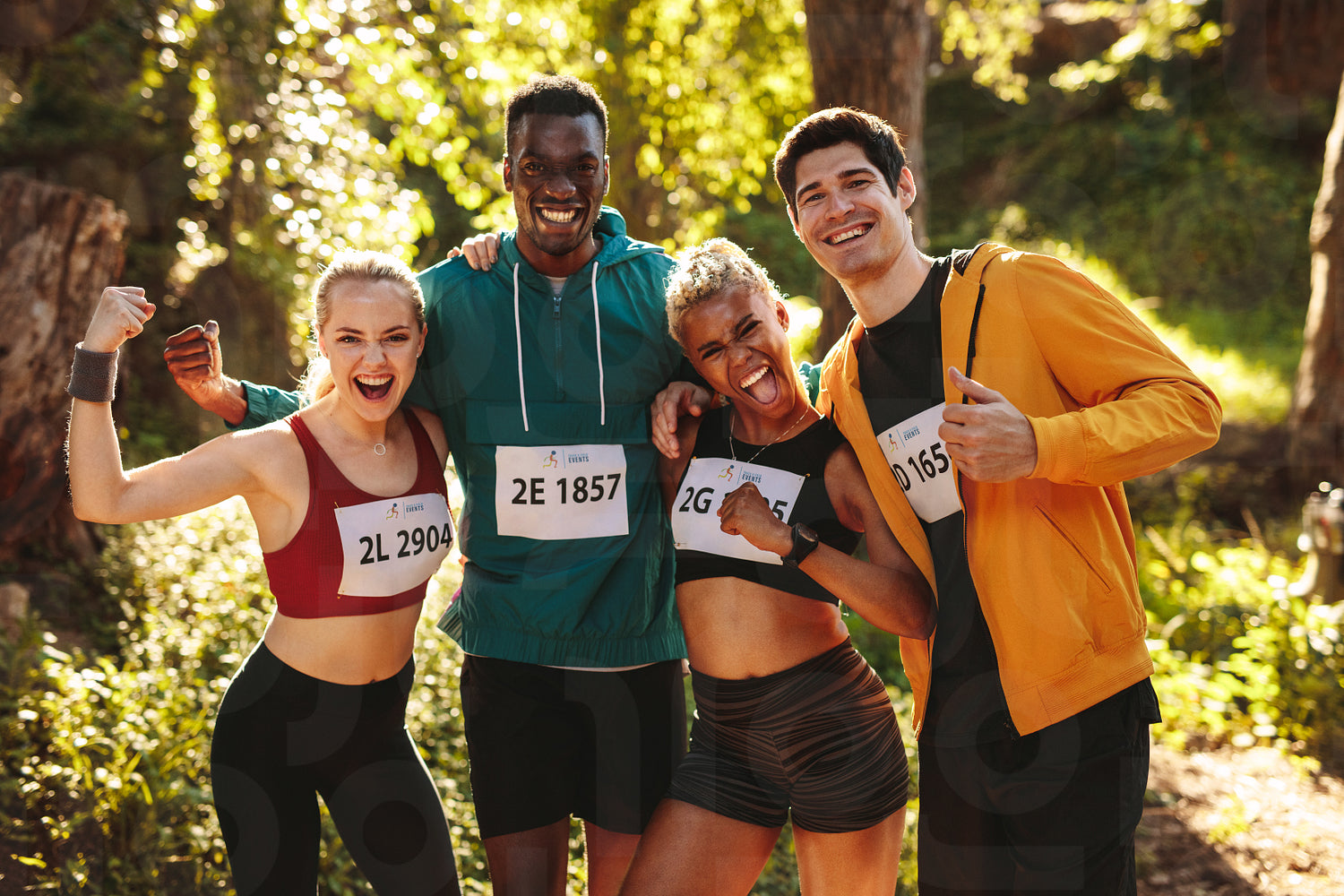 Team of runners celebrating after winning the race. Happy marathon runners standing together after running a race in the forest.