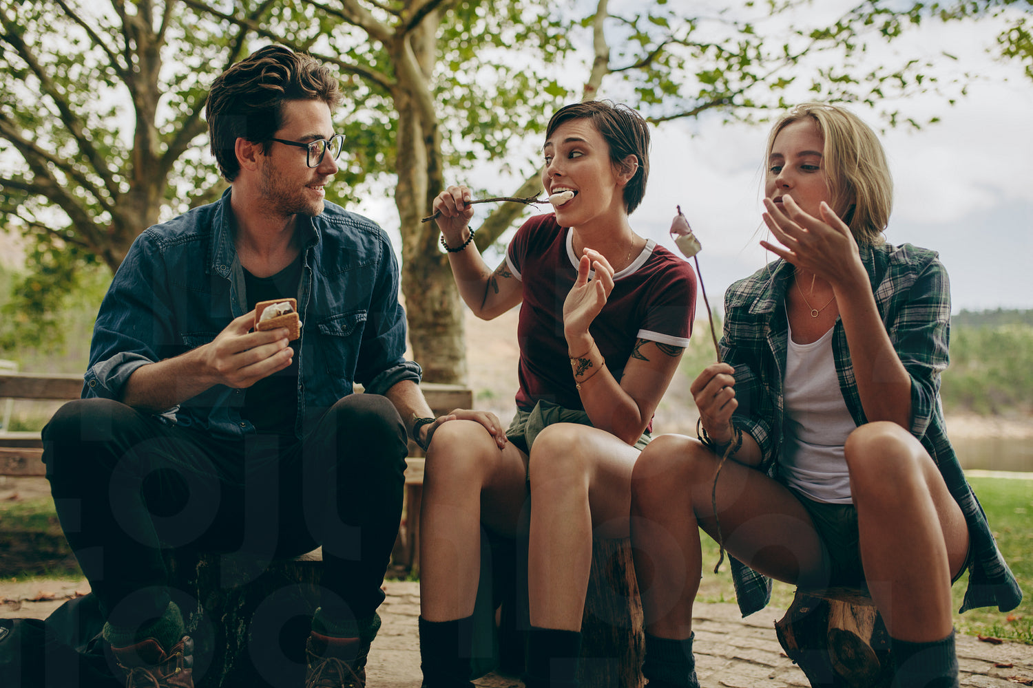 Tourist friends on vacation eating toasted snacks sitting outdoors in the country side. Man with two female friends camping in the country side eating snacks.