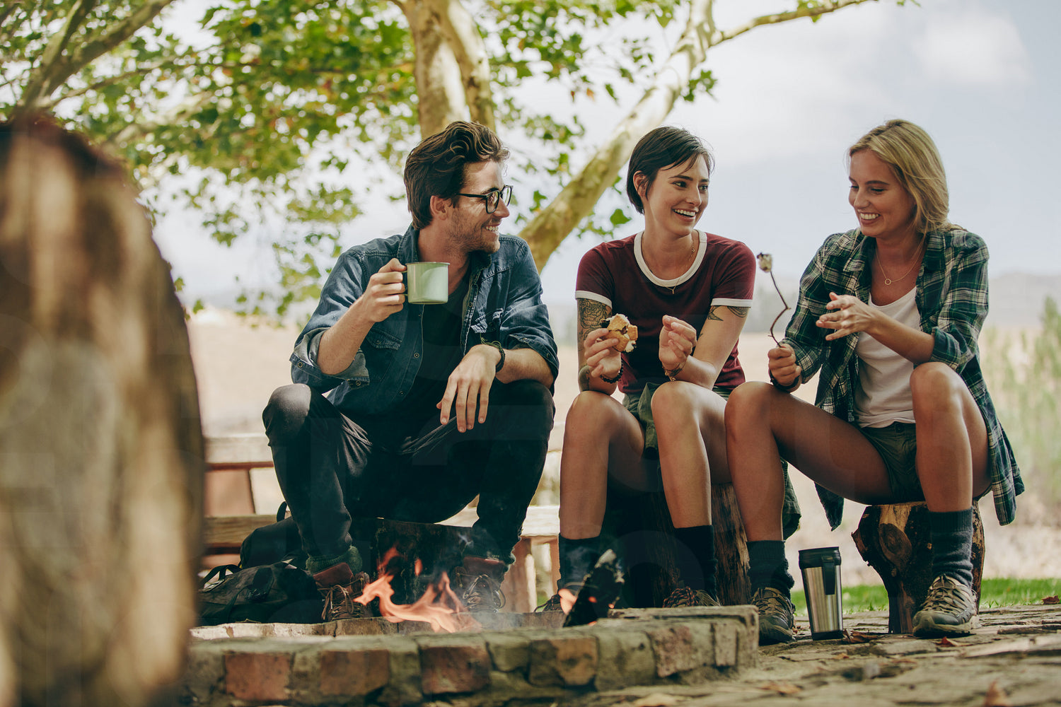 Friends camping in forest sitting near a bonfire. Woman toasting marshmallows on campfire sitting with friends outdoors.