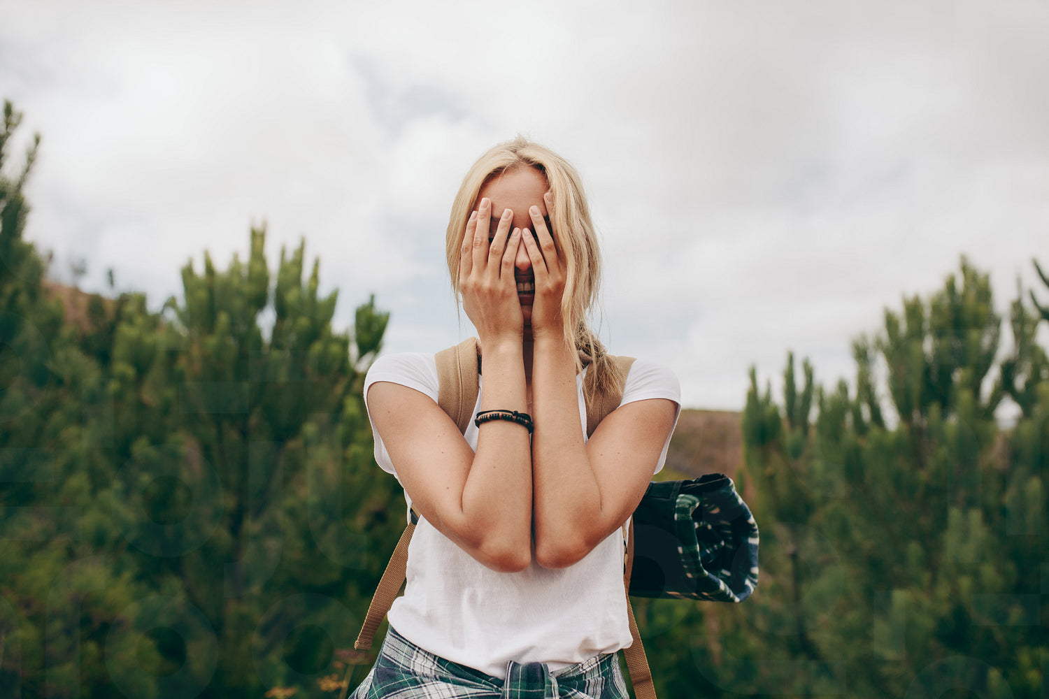 Female traveller covering her face with hands standing in a forest. Woman on a holiday carrying travel bag.