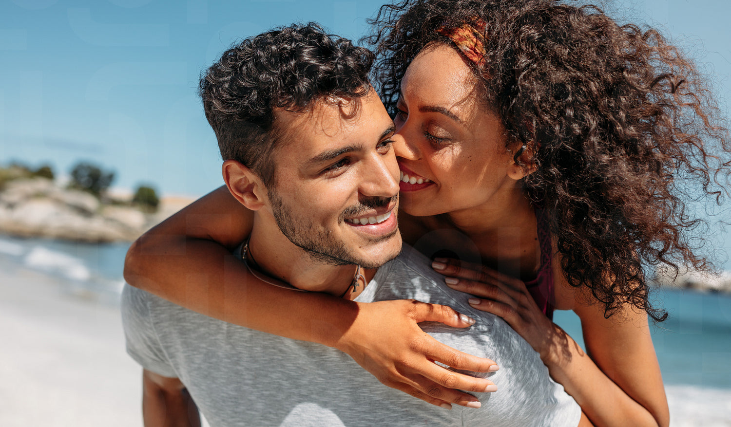 Smiling woman piggy riding on her boyfriend and kissing him. Man carrying his girlfriend on his back outdoors.