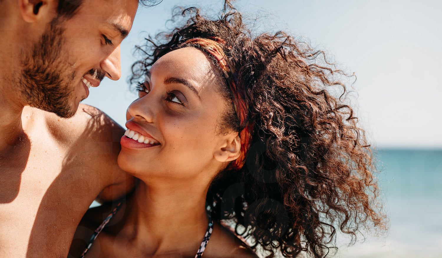 Close up of a curly haired woman looking in the eyes of her boyfriend standing on the beach. Romantic couple having fun at the beach.