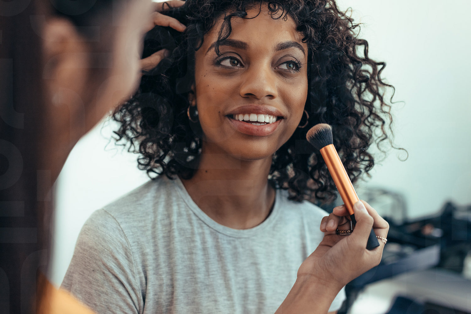makeup artist preparing a model for a photo shoot. Close up of a model getting ready for photo shoot.