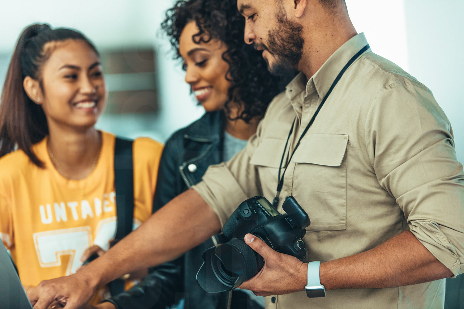 Photographer doing a review of the photo shoot with his team. Models looking at shoot photographs and smiling.