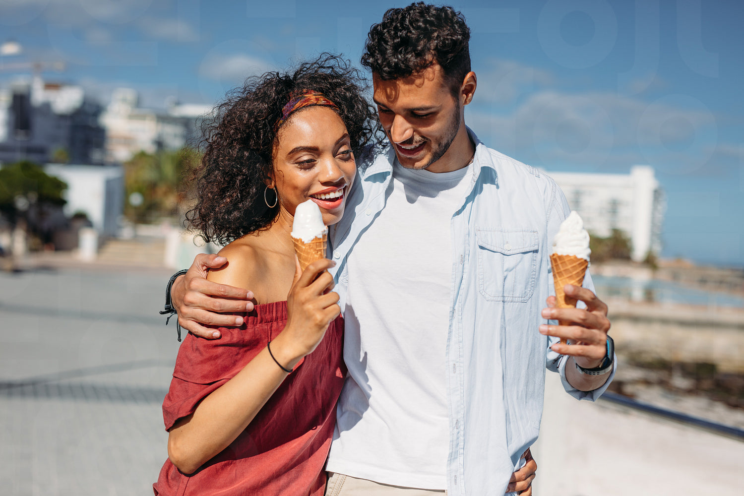 Couple in love walking on city street eating ice creams. Young man and woman spending time together walking on street talking and eating ice cream.