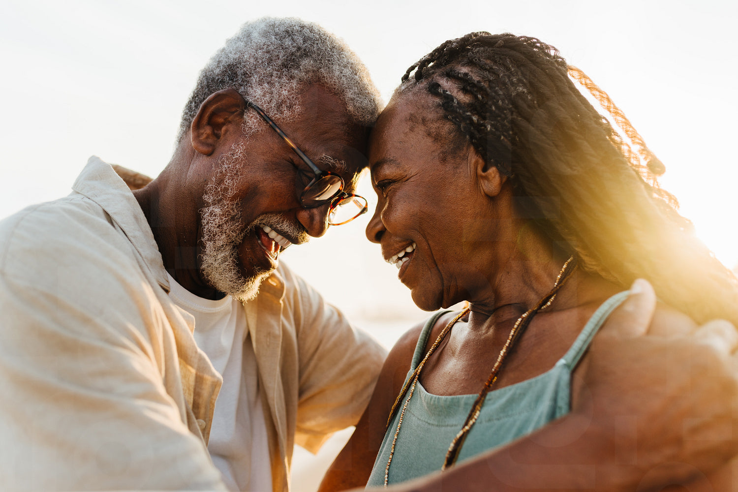 Loving senior African American couple sharing an intimate moment with their foreheads touching on a sunny beach.