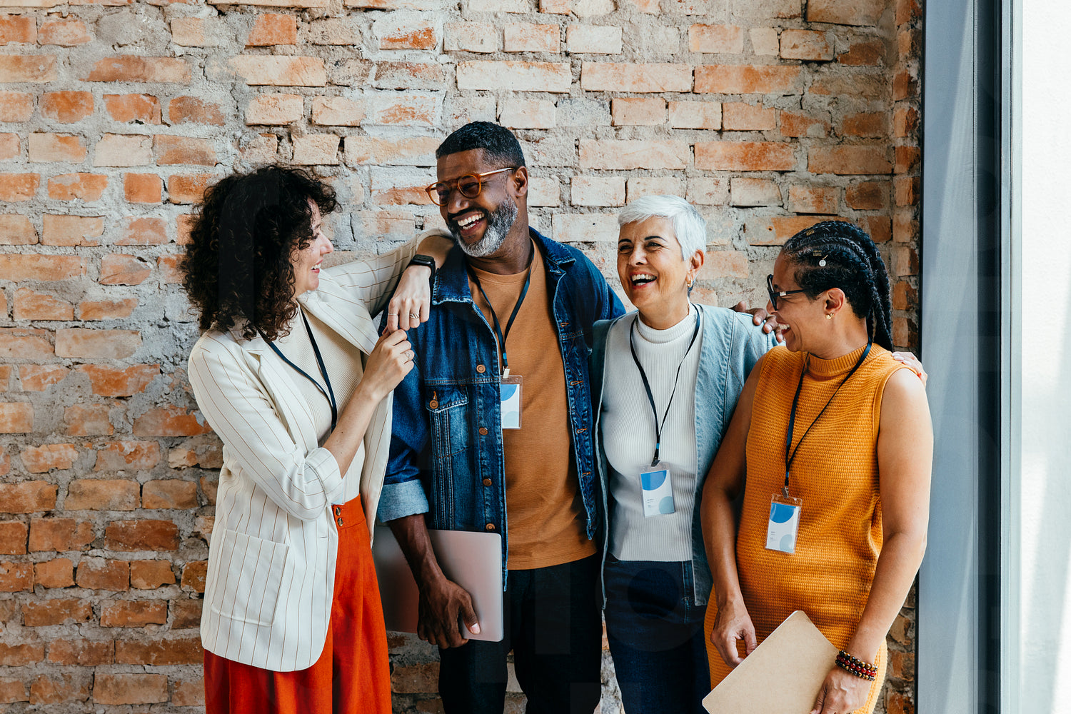Diverse coworkers enjoy a lighthearted moment, showcasing teamwork and friendship in a modern office environment. Ideal for concepts of collaboration and diversity.