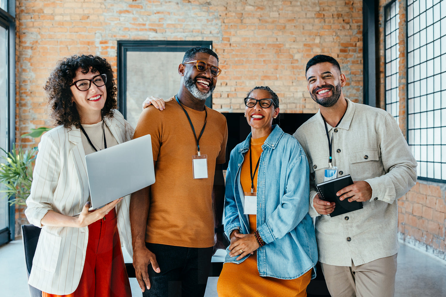 Team of business people smiling and laughing together in a modern startup setting, emphasizing teamwork and camaraderie.