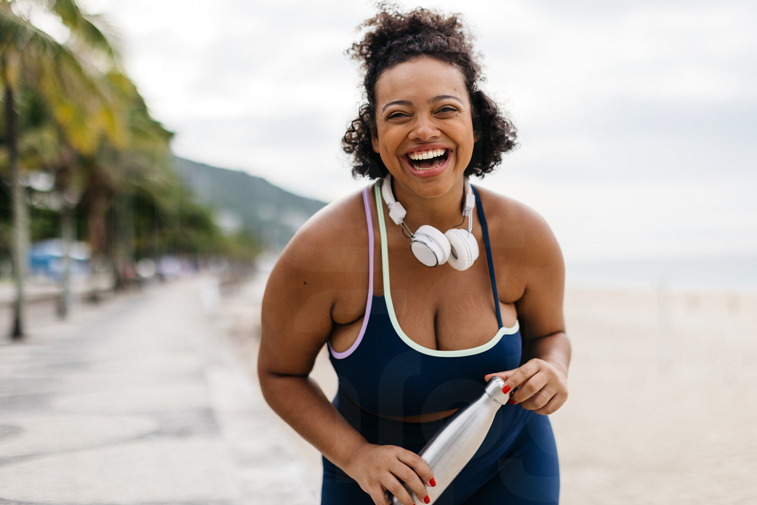 Happy young woman standing on a beach promenade near the ocean, holding a sports water bottle and laughing excitedly. Healthy young woman going for a beach workout in fitness clothing.