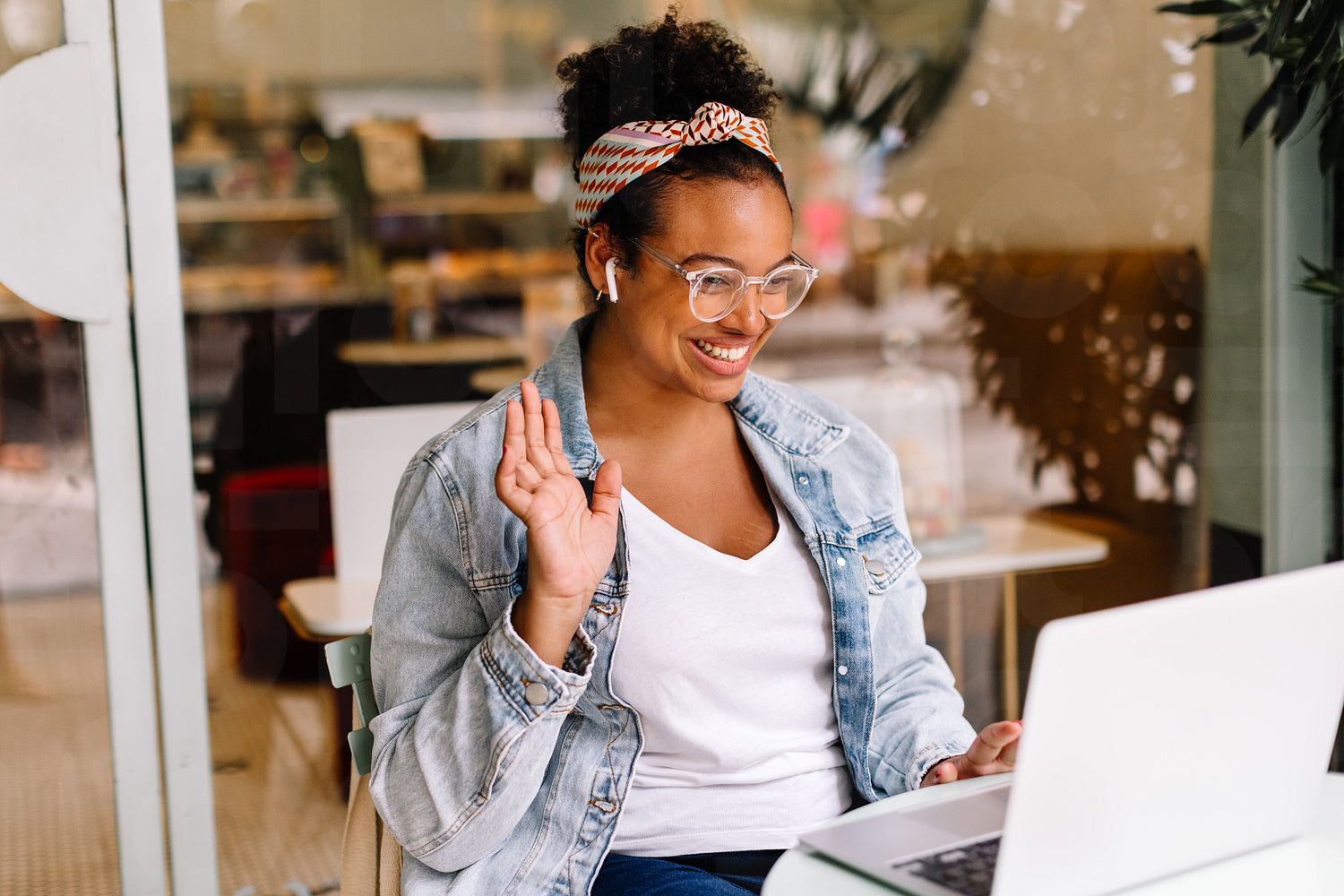 Happy young businesswoman in a cafe, using a laptop for a video call and online meeting. Female professional waving to a colleague, working remotely with wireless technology.