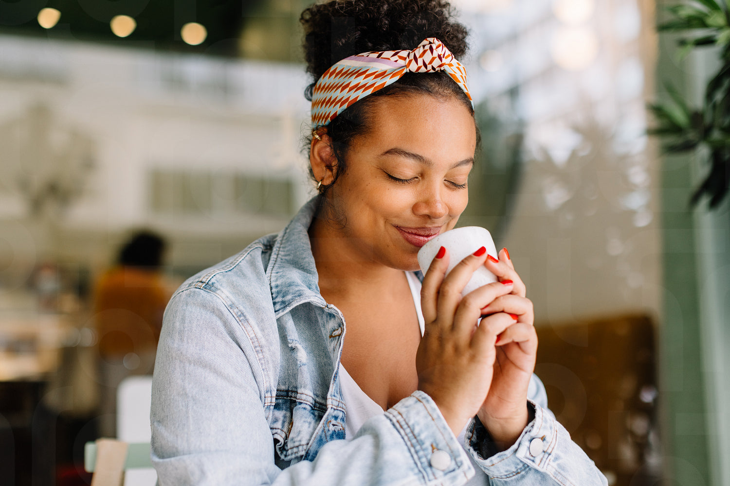 Young woman in a cozy coffee shop, enjoying a cup of coffee. Her smiling face reflects happiness as she takes a moment to relax in this serene solo date.