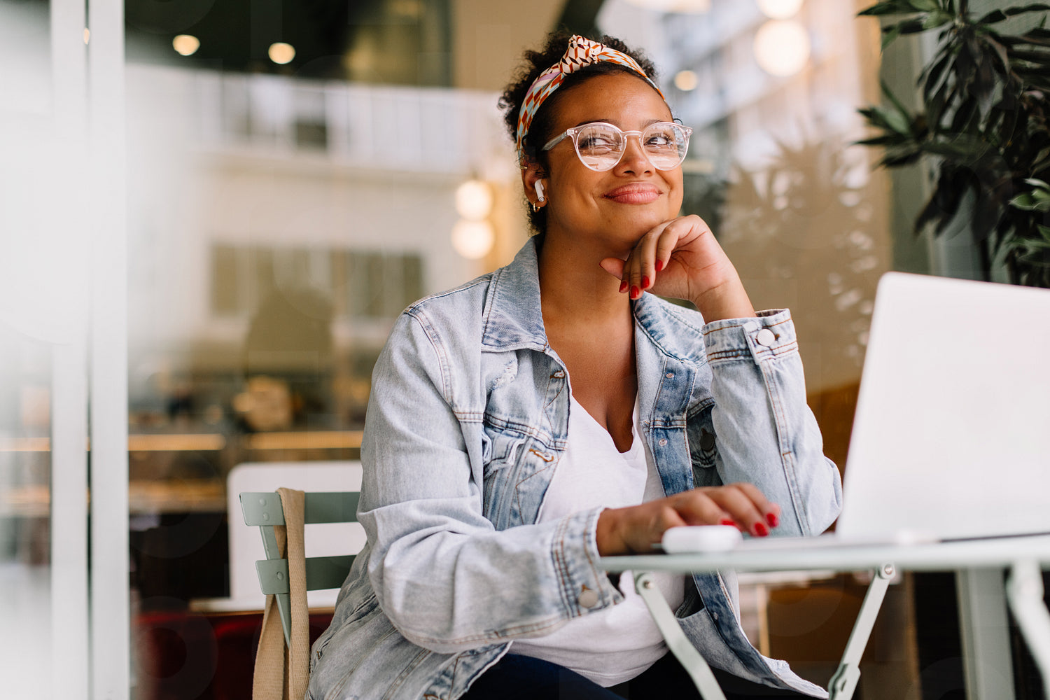 Young woman works remotely in a cozy coffee shop, using a laptop. She is a freelance content writer, focused and pensive as she works on her website writing project.