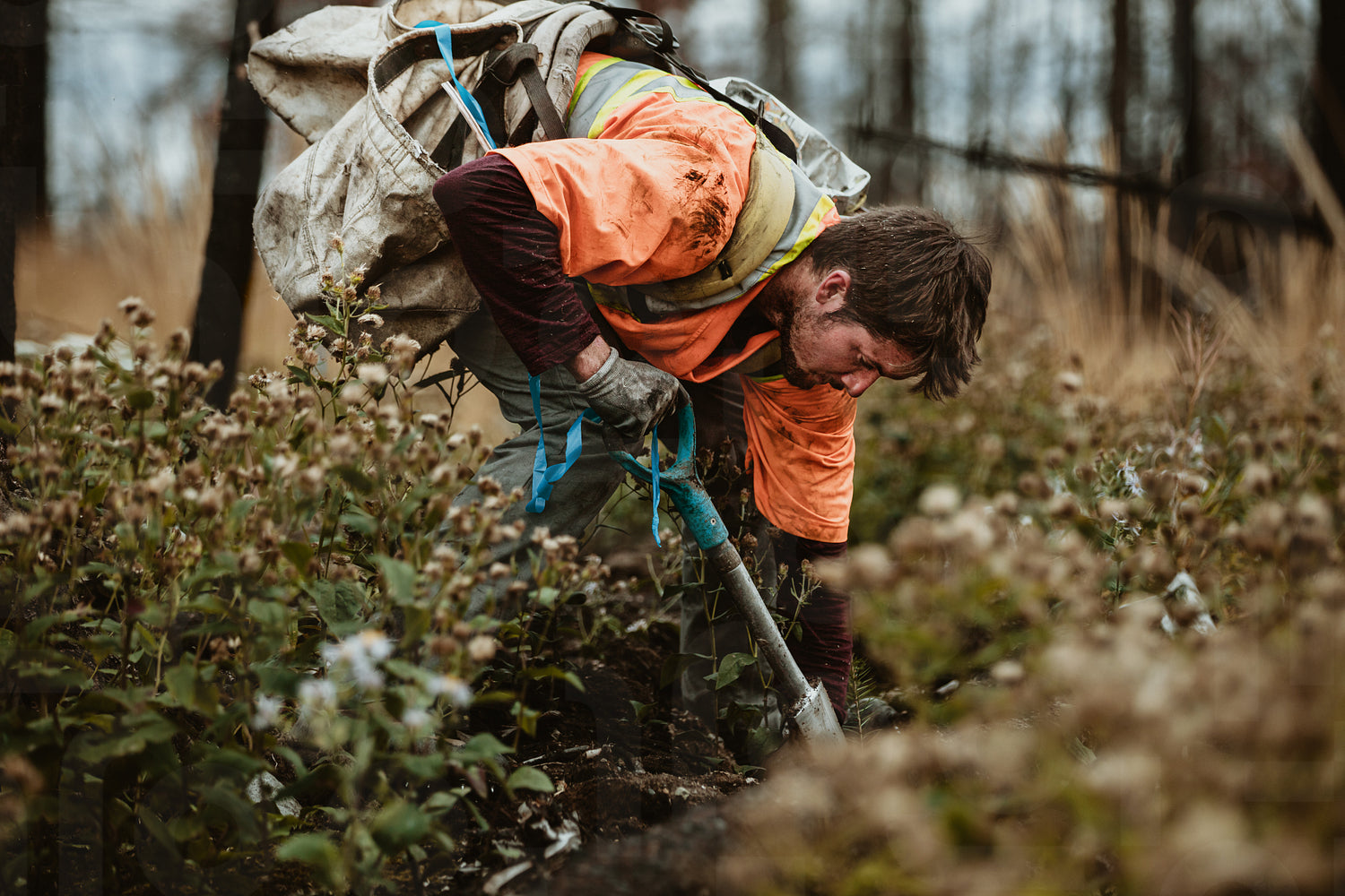 Forest ranger planting new seedlings. Man digging hole with shovel to plant new trees in forest.