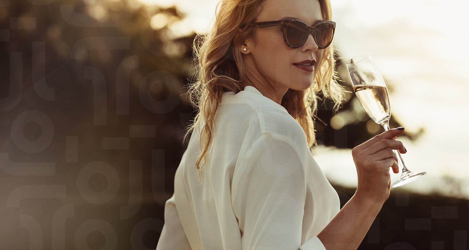 Beautiful young woman drinking wine outdoors. Stylish female in sunglasses having a glass of wine.