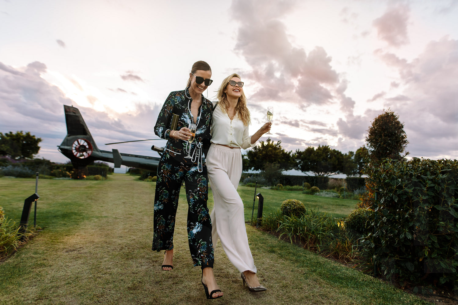 Full length of two young women walking together with a helicopter parked in background. Stylish females enjoying a luxurious lifestyle.