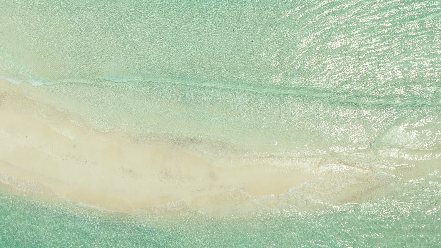 Aerial view of a pristine white sandbar surrounded by crystal clear turquoise ocean water and gentle waves