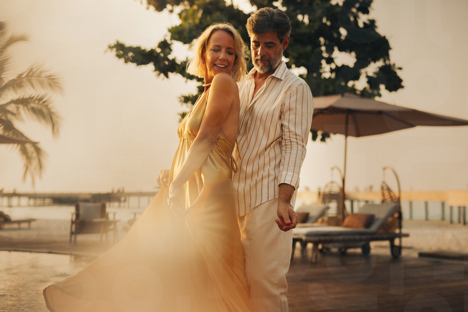 Flirty couple enjoying a carefree holiday moment poolside on a tropical pier.