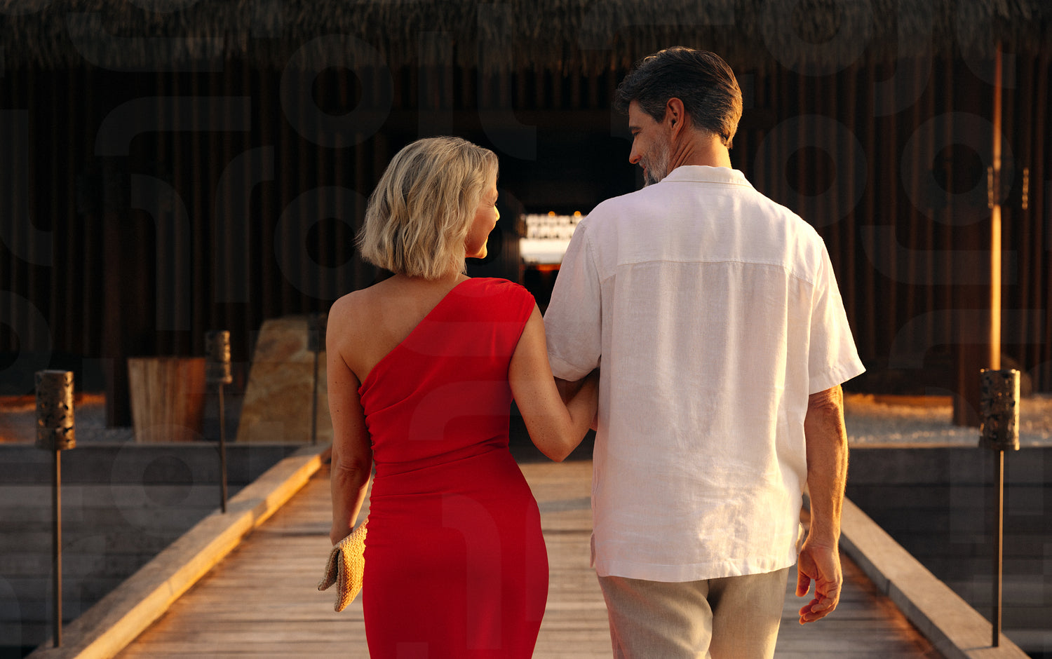 Stylish couple walking arm in arm at sunset toward a luxury resort restaurant. Highlights romance, fine dining, and upscale hospitality experiences in a premium tropical destination.