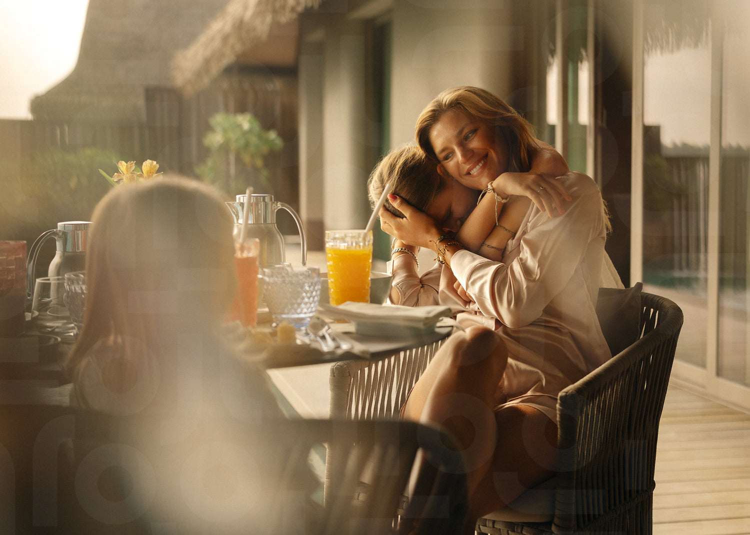 Mother sharing affectionate moment with daughter during breakfast outdoors at a vacation hotel villa