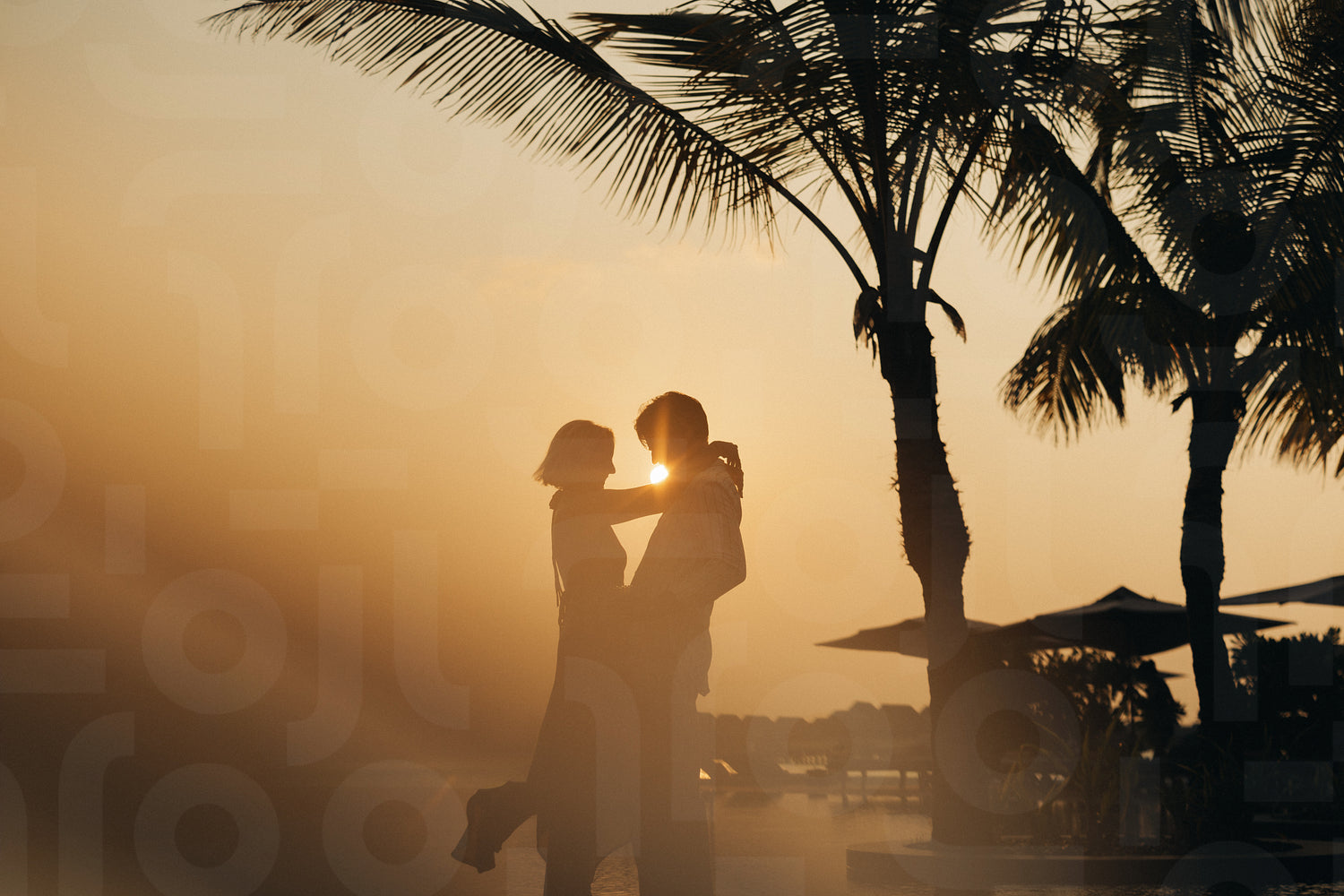 Silhouette of a couple dancing by the ocean at sunset in a tropical vacation environment, capturing a romantic and serene moment.