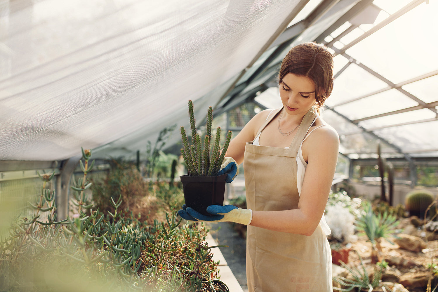 Woman gardener in tropical greenhouse holding a cactus plant. Caucasian female wearing apron taking care of cactus plants at garden center.