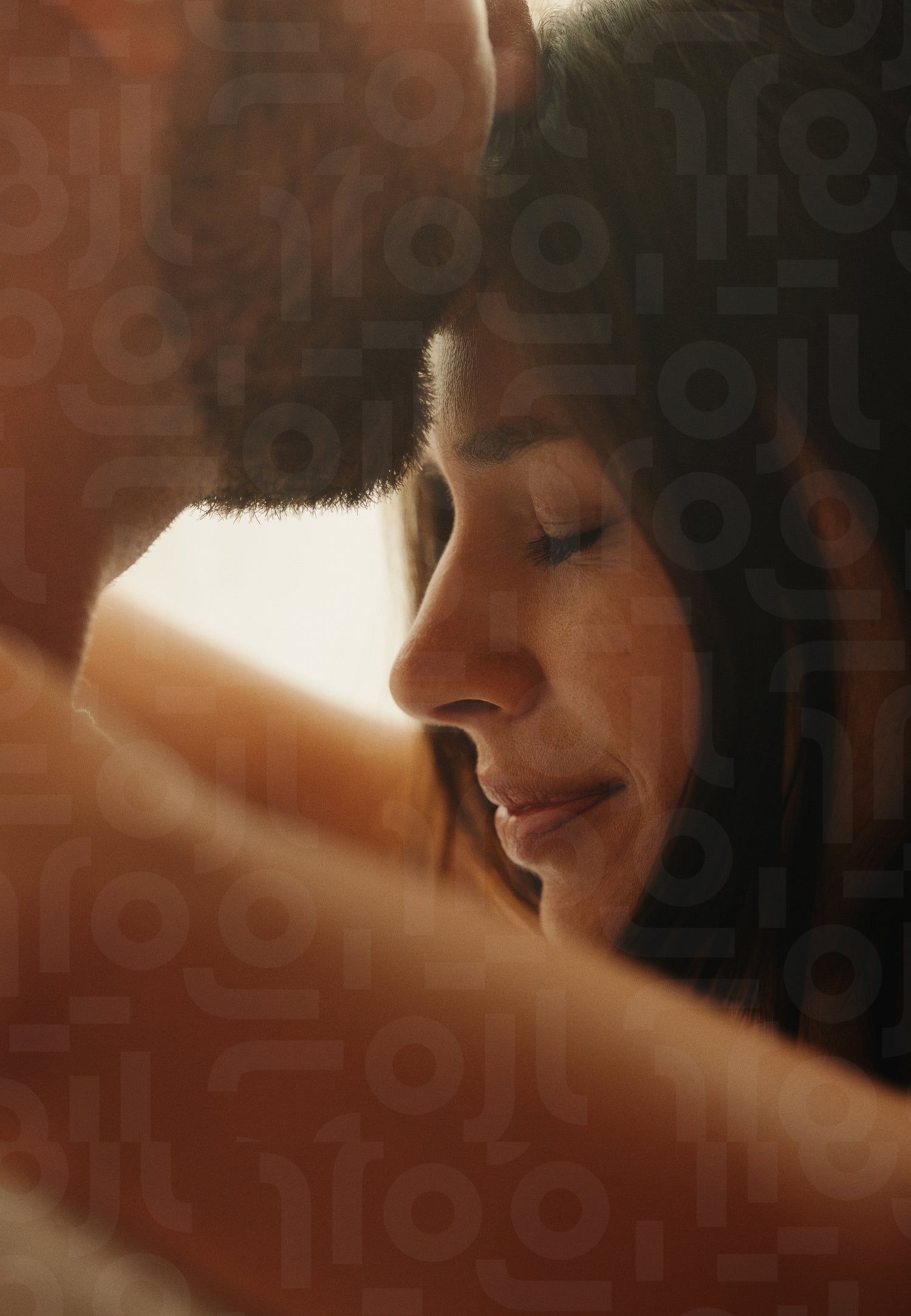 Intimate moment between a couple with a close-up of a woman's content face, softly lit, as a man kisses her forehead.This photo features intentional 35mm film grain.