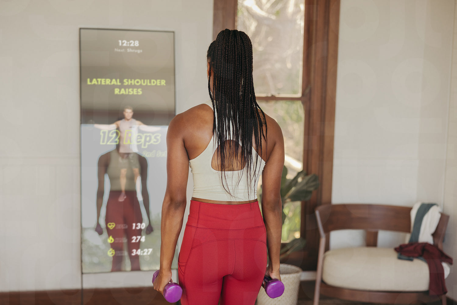 With the help of a virtual instructor on a smart fitness mirror, a woman engages in weight training exercises, using advanced fitness technology to get the most out of her workout and achieve her fitness goals.