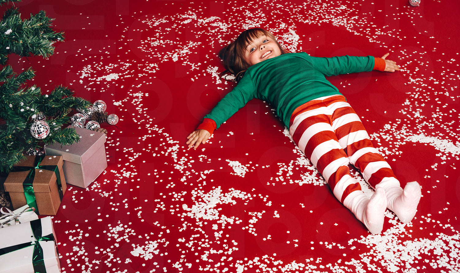 Happy little girl lying on floor beside a christmas tree. Kid having fun playing with snow flakes lying on floor beside a decorated christmas tree.