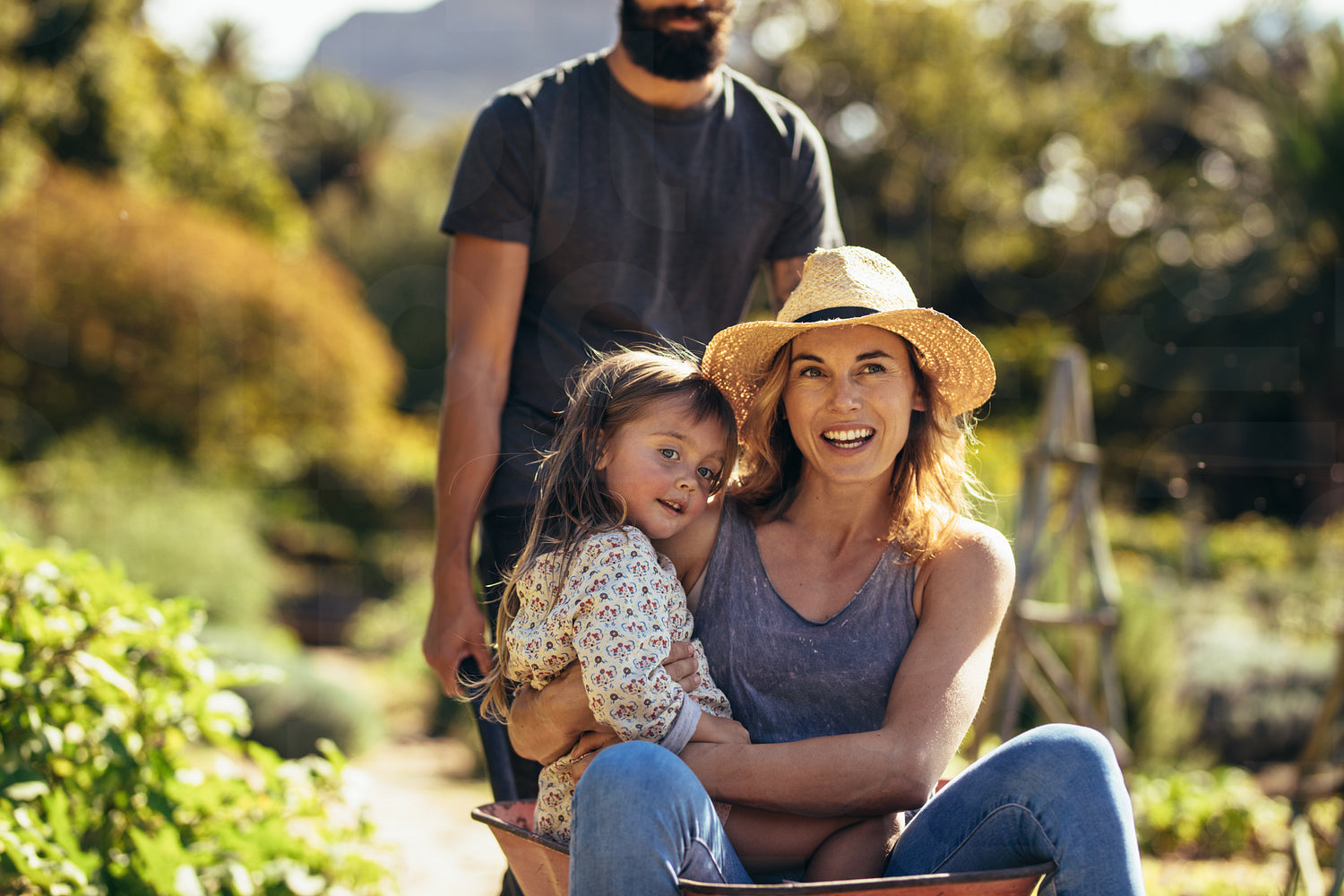 Man pushing woman and little girl in wheelbarrow. Mother and daughter ride in wheelbarrow pushed by father in farm.