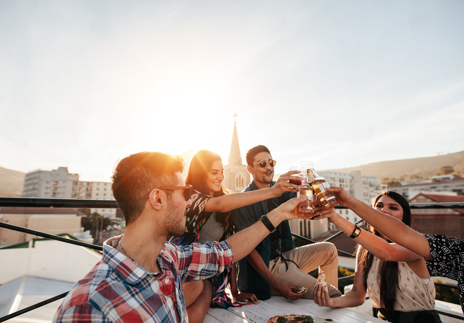 Young friends hanging out with drinks on rooftop. Young people at party toasting beers.