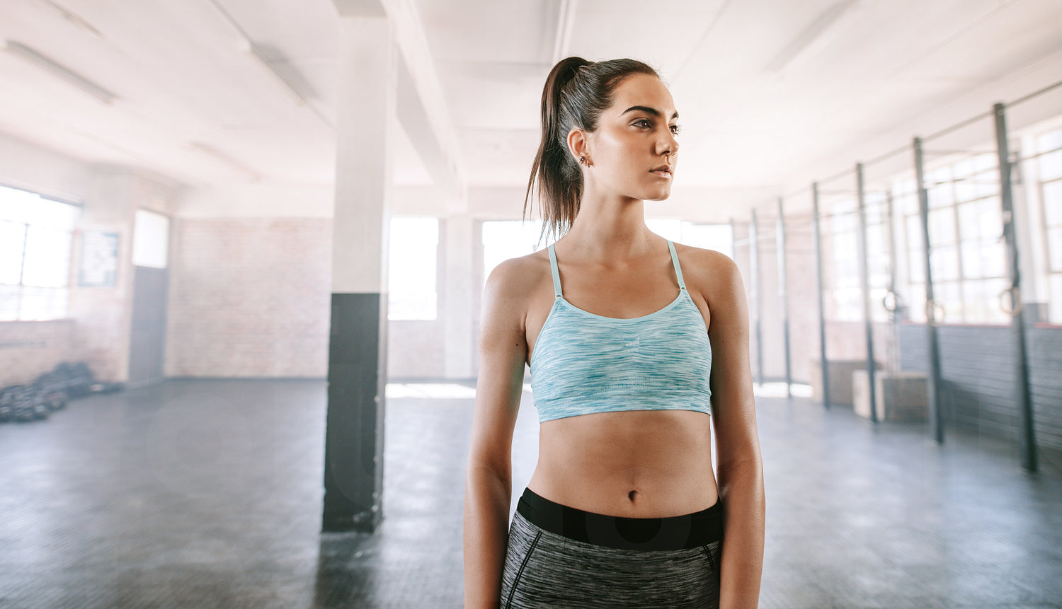 Portrait of healthy young woman standing in gym and looking away. Fitness woman in sportswear.