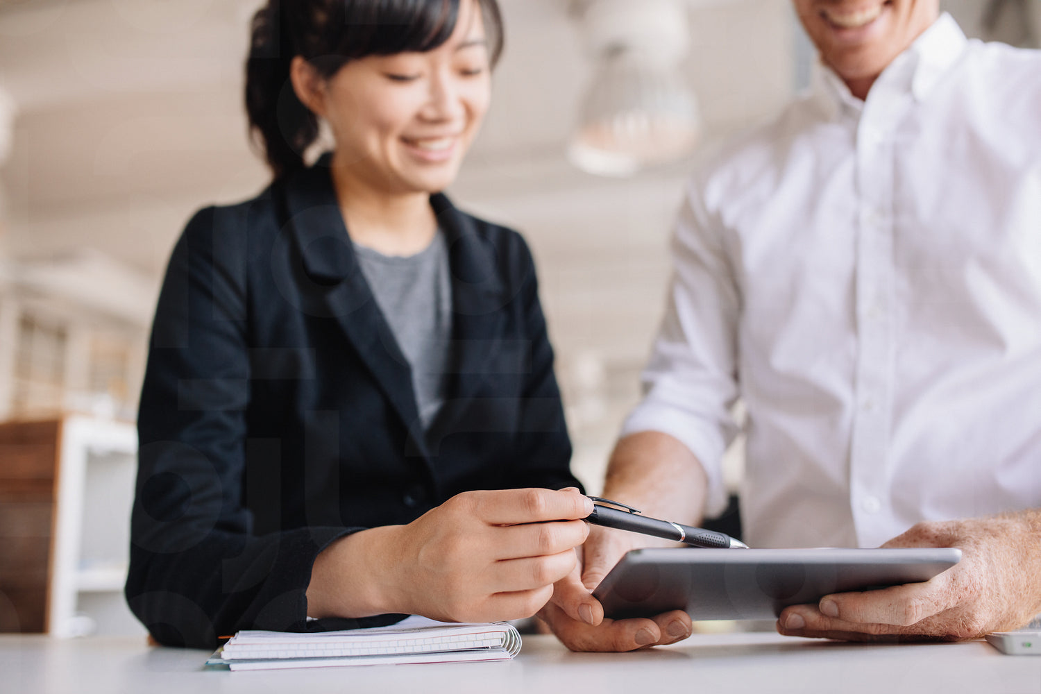 Two young business people working together, with female executive pointing digital tablet. Businessman and businesswoman using touchscreen computer in office.