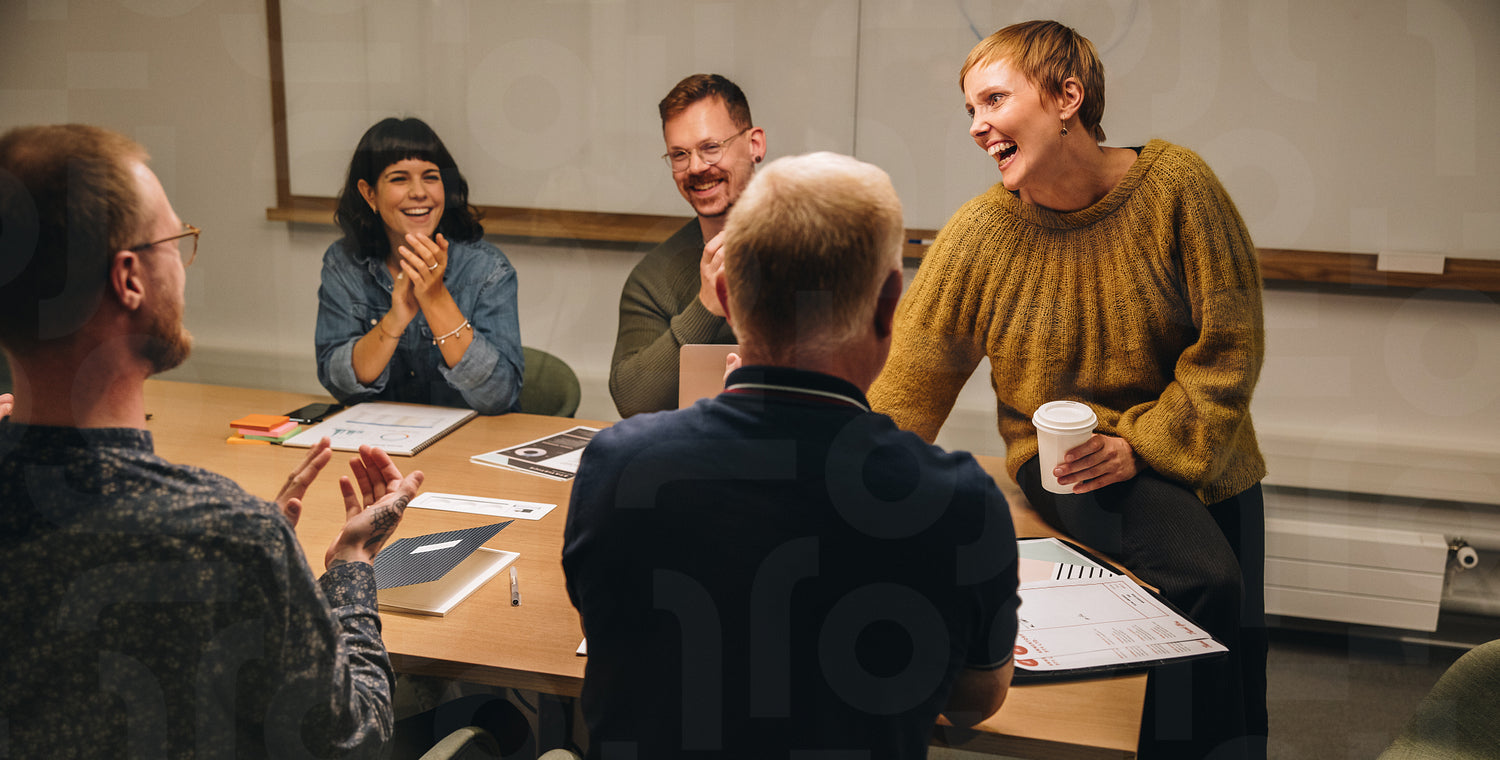 Business team smiling during meeting in office. Businesswoman sharing good news in meeting and colleagues clapping hands.