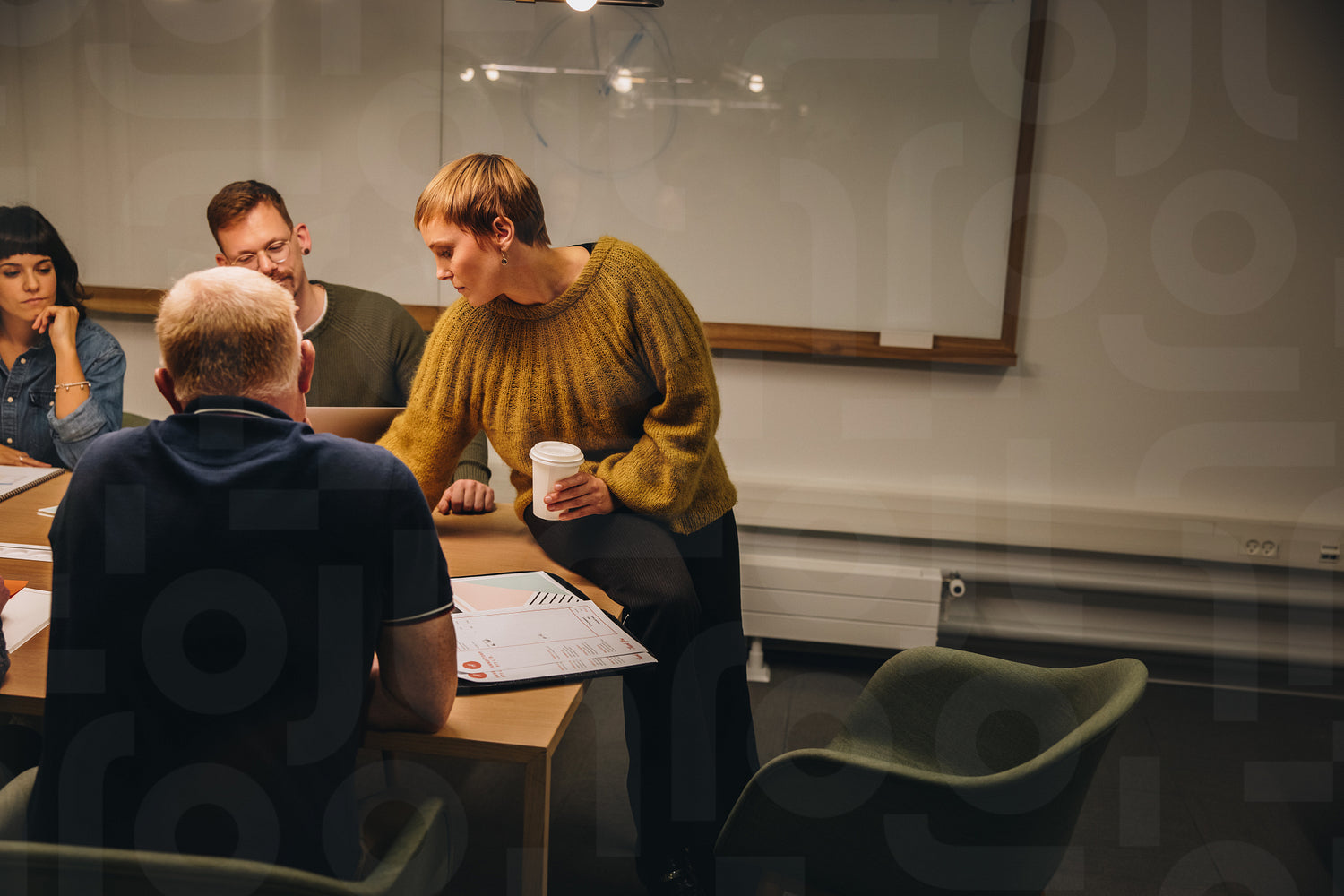 Businesswoman sharing ideas with team in meeting. Group of business professionals having conference meeting.