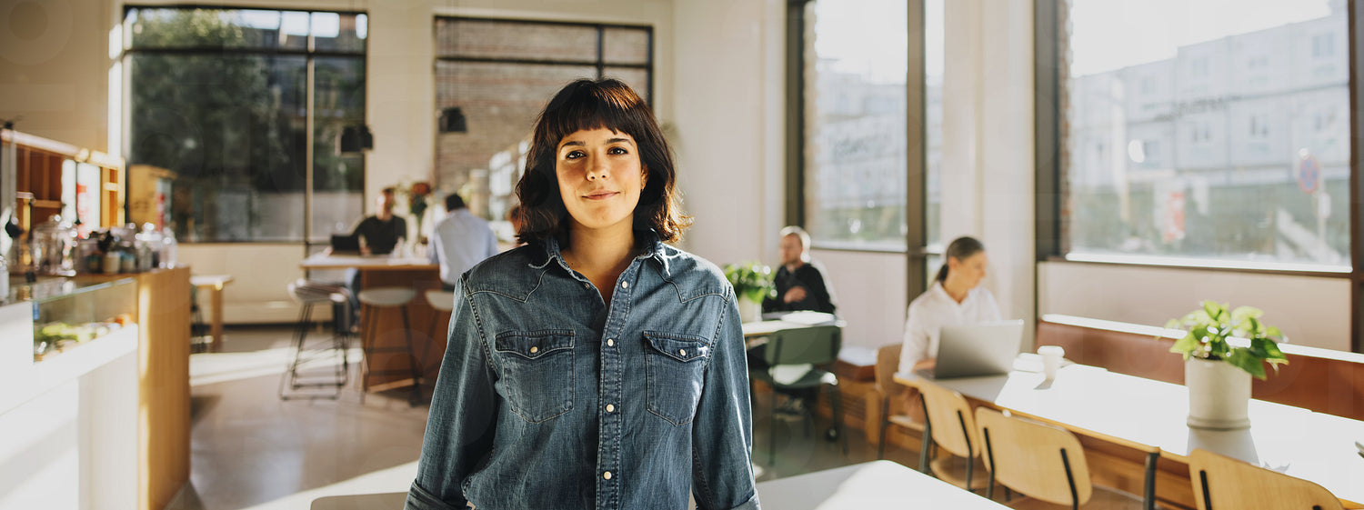 Portrait of a business woman standing in open plan co-working office. Female business professional portrait shot.
