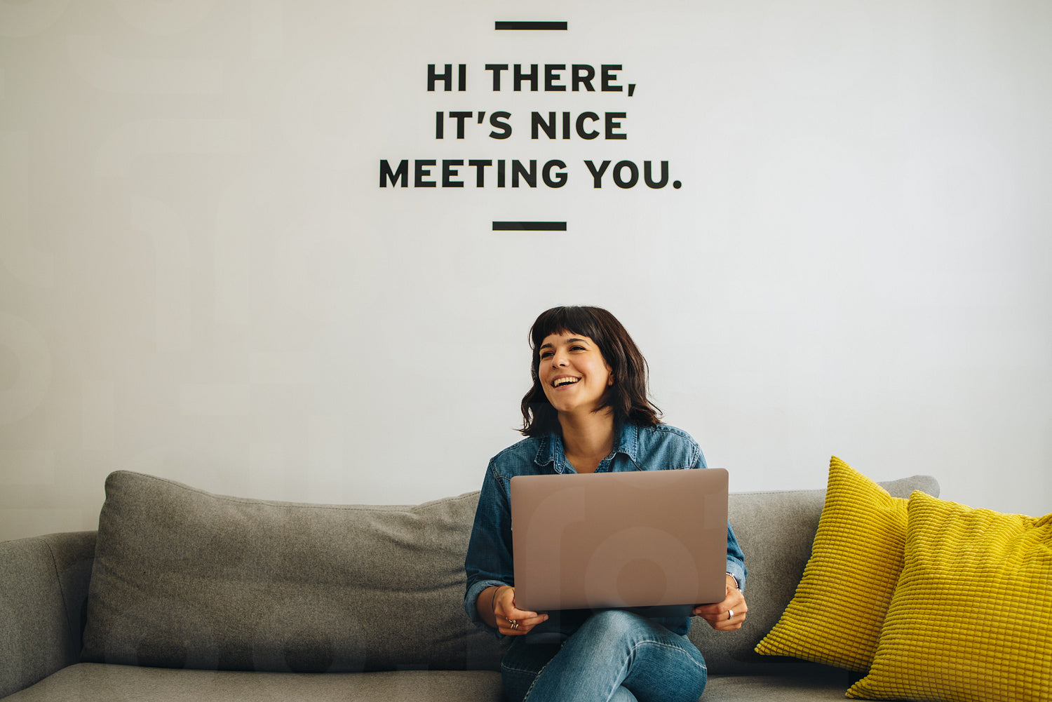 Female holding laptop and looking away while sitting at lobby. Smiling businesswoman with laptop looking away and sitting on sofa.