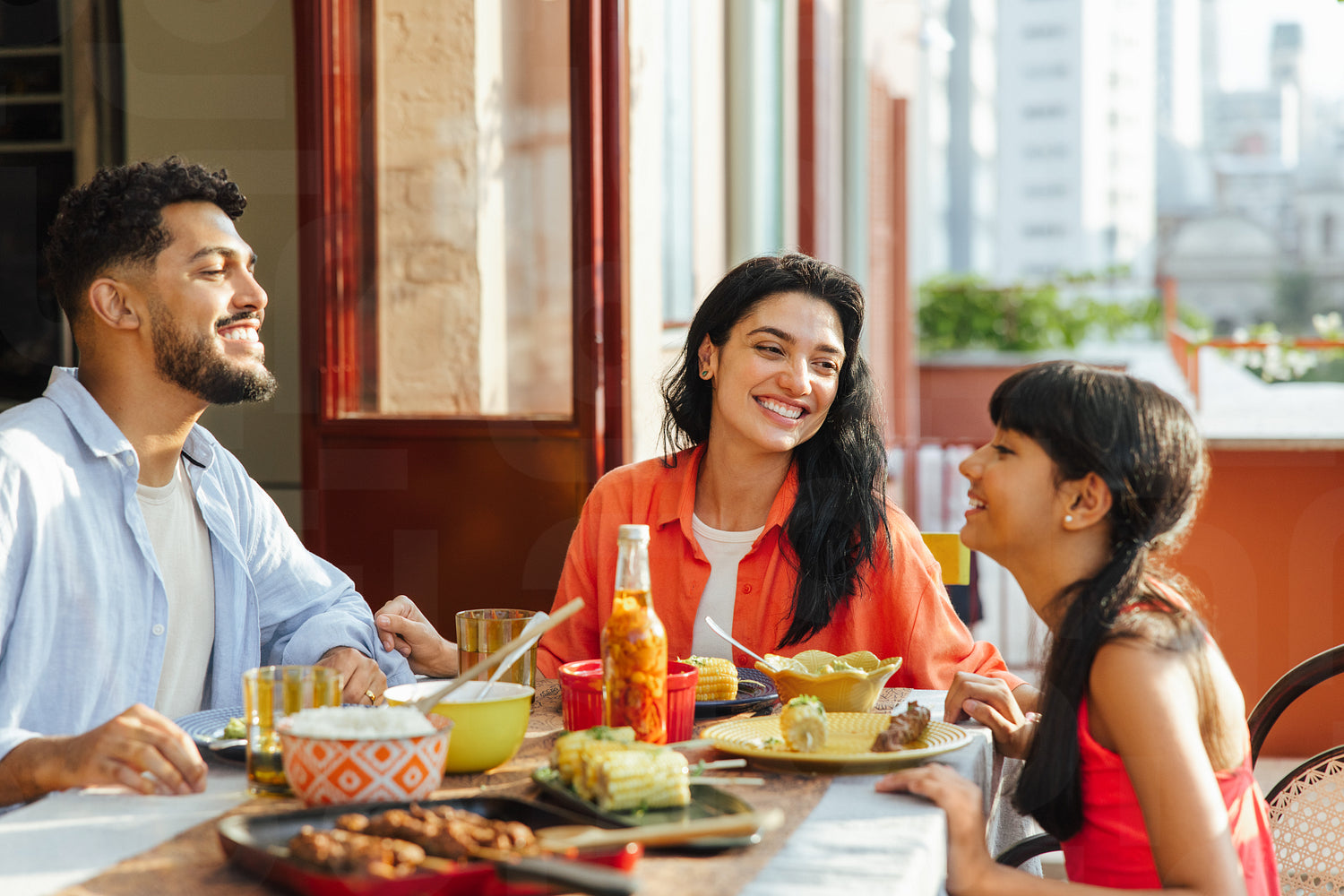 Smiling latin family enjoying a meal together in a sunny outdoor setting