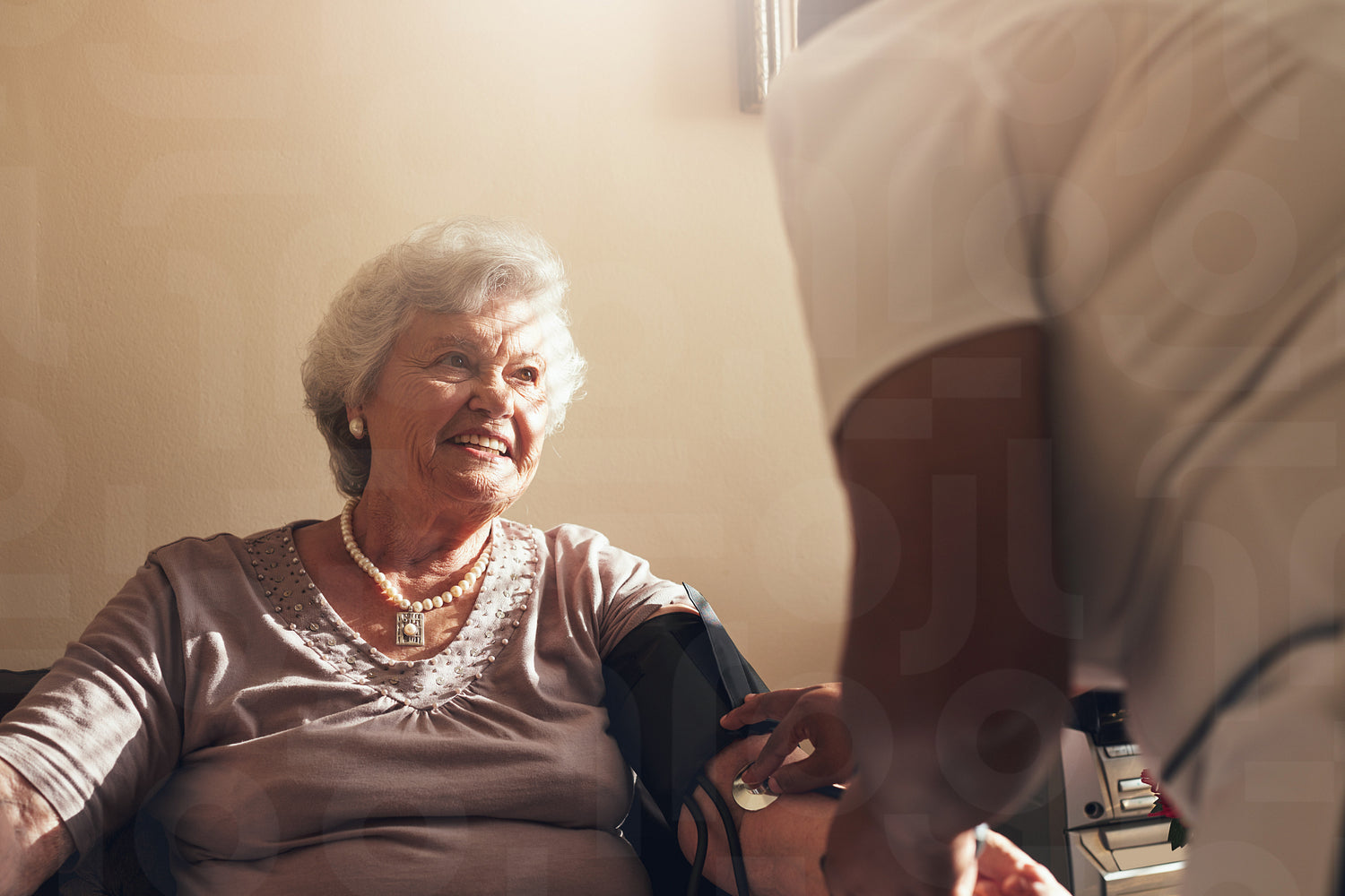 Senior woman sitting on a chair at home with female caregiver checking her blood pressure. Elderly woman getting routine check from a female doctor.